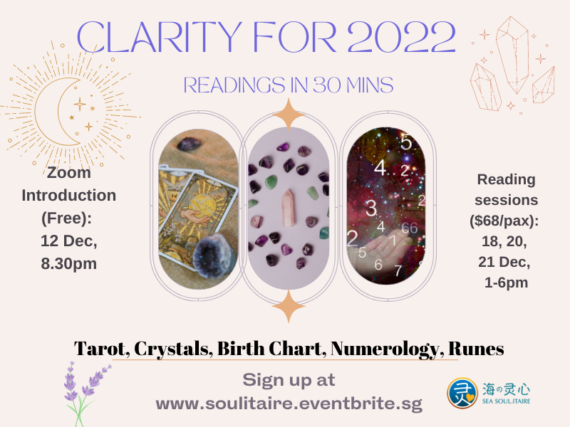 Booking for other reading sessions on 18, 20, 21 December by various healers/readers can be found via https://soulitaire.eventbrite.sg